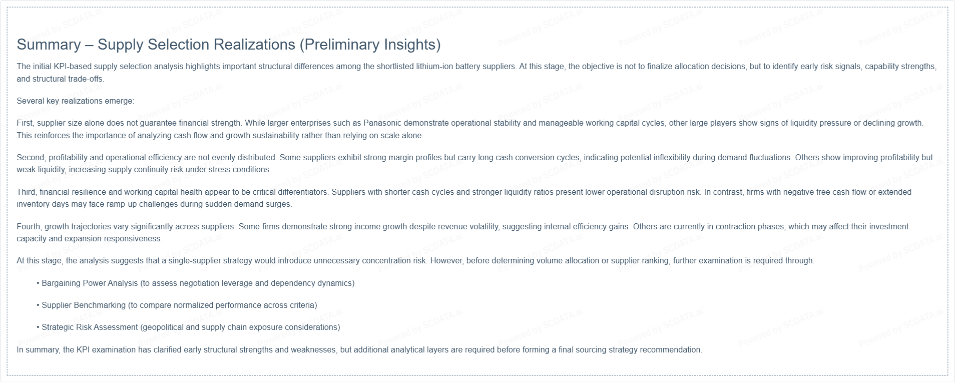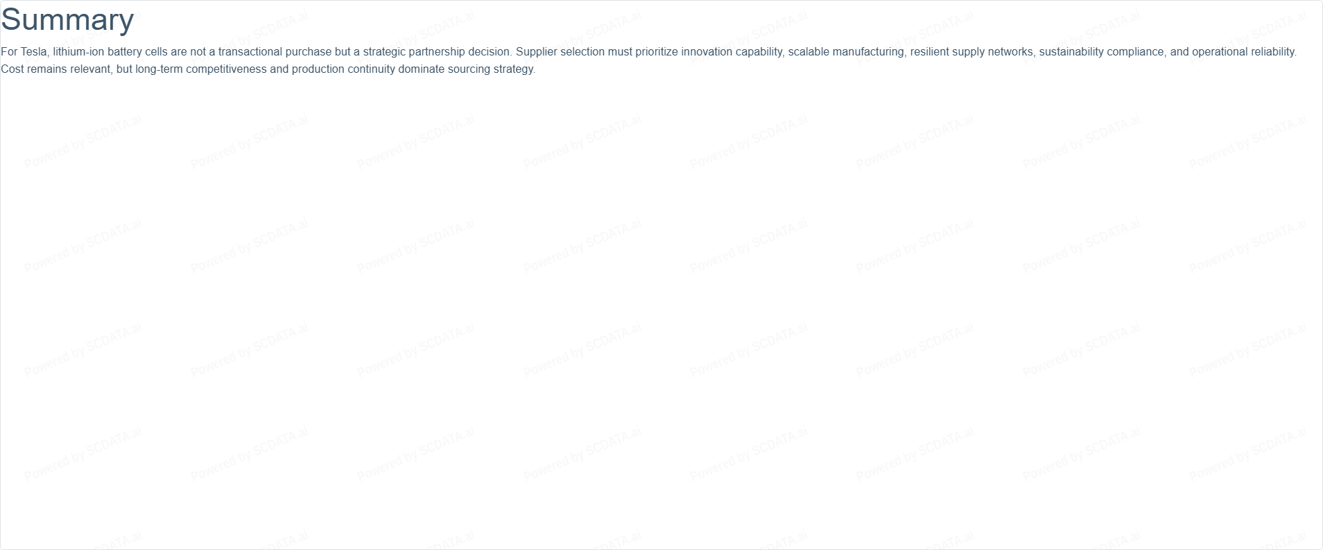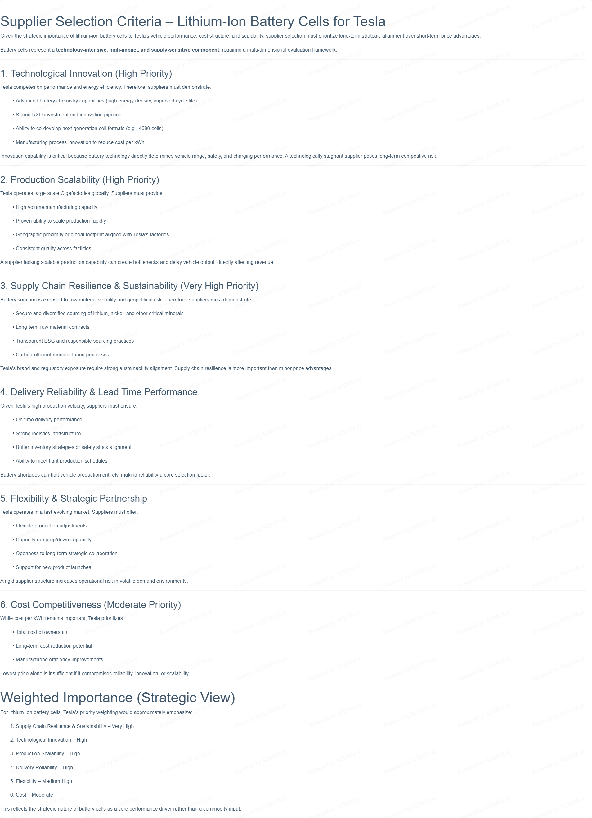 Given the strategic importance of lithium-ion battery cells to Tesla’s vehicle performance, cost structure, and scalability, supplier selection must prioritize long-term strategic alignment over short-term price advantages.