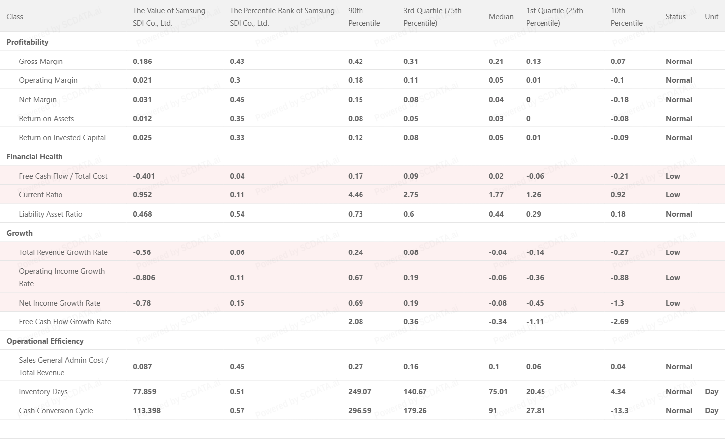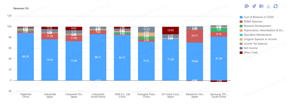 Samsung SDI looks operationally disciplined: COGS 81.36%, SG&A 8.75%, R&D 7.82%, and “Other Costs” -2.66% (other income help).