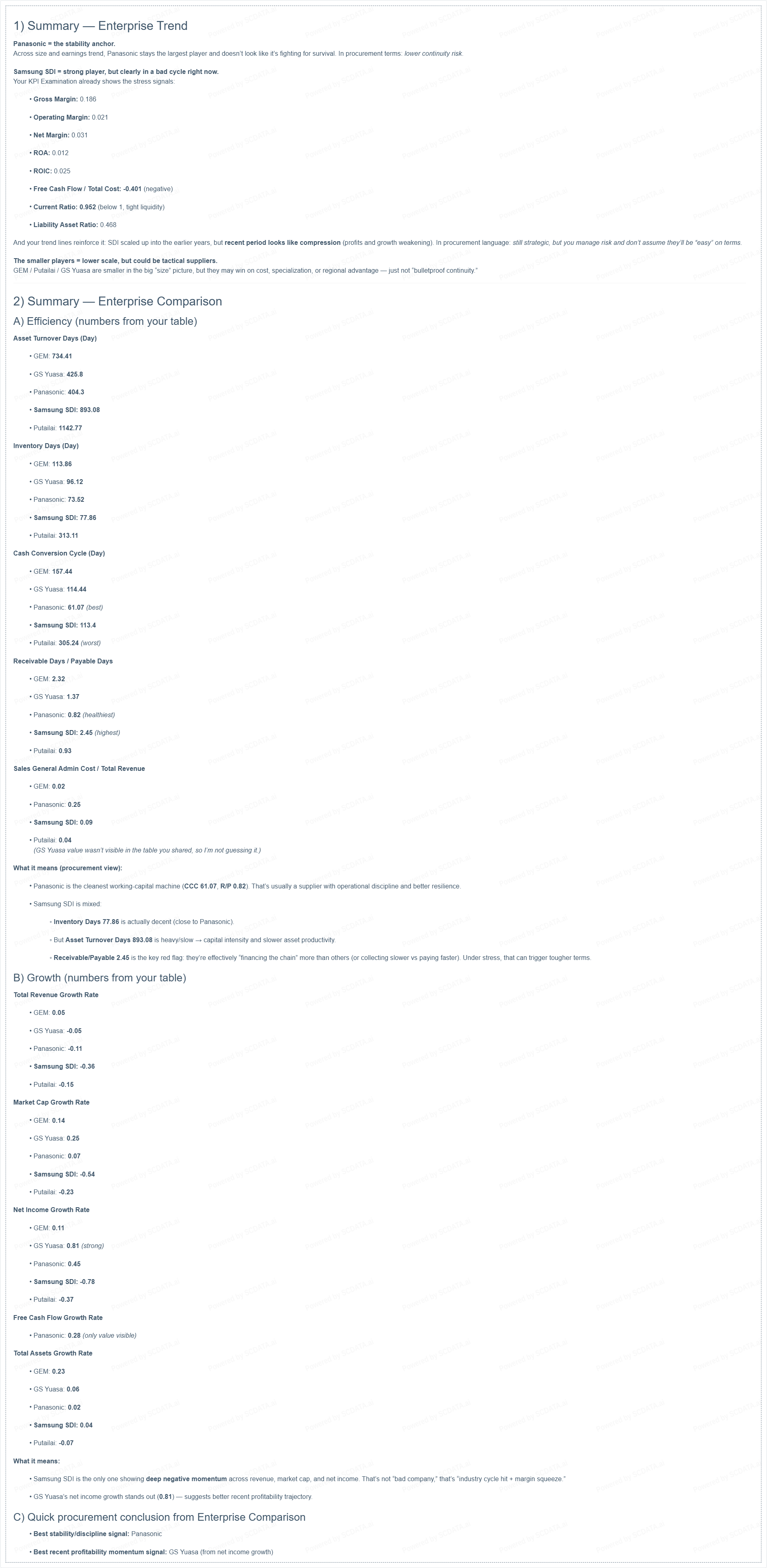 GEM and Putailai look like strong bargaining-leverage targets for Tesla (especially cost/volume negotiation), but they need guardrails. The efficiency and cycle metrics suggest higher working-capital stress and weaker operational discipline relative to the leaders. That’s exactly where a buyer like Tesla can push hard on commercial terms—but it’s also where procurement must protect Tesla from execution risk. These suppliers fit best as competitive pressure in a multi-supplier model rather than sole-source anchors.