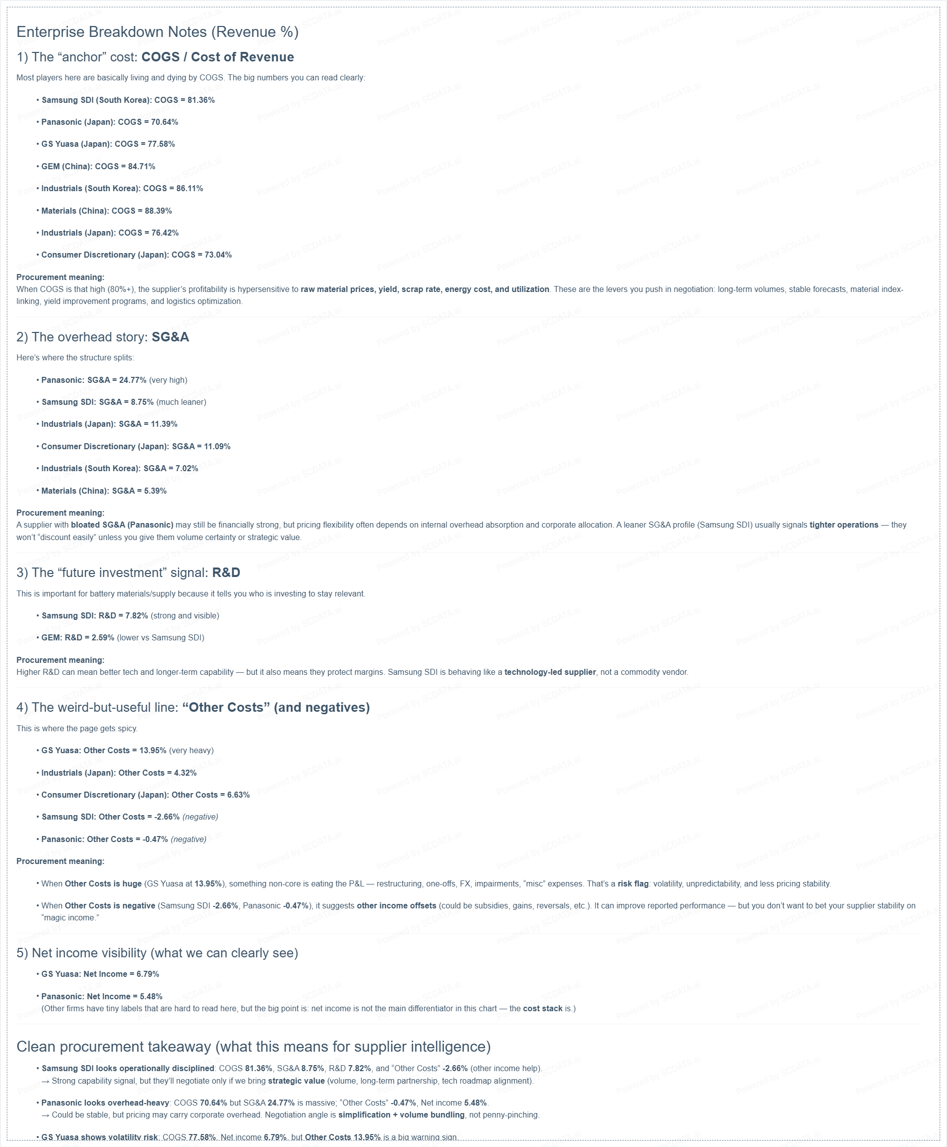 When Other Costs is negative (Samsung SDI -2.66%, Panasonic -0.47%), it suggests other income offsets (could be subsidies, gains, reversals, etc.). It can improve reported performance — but you don’t want to bet your supplier stability on “magic income.”