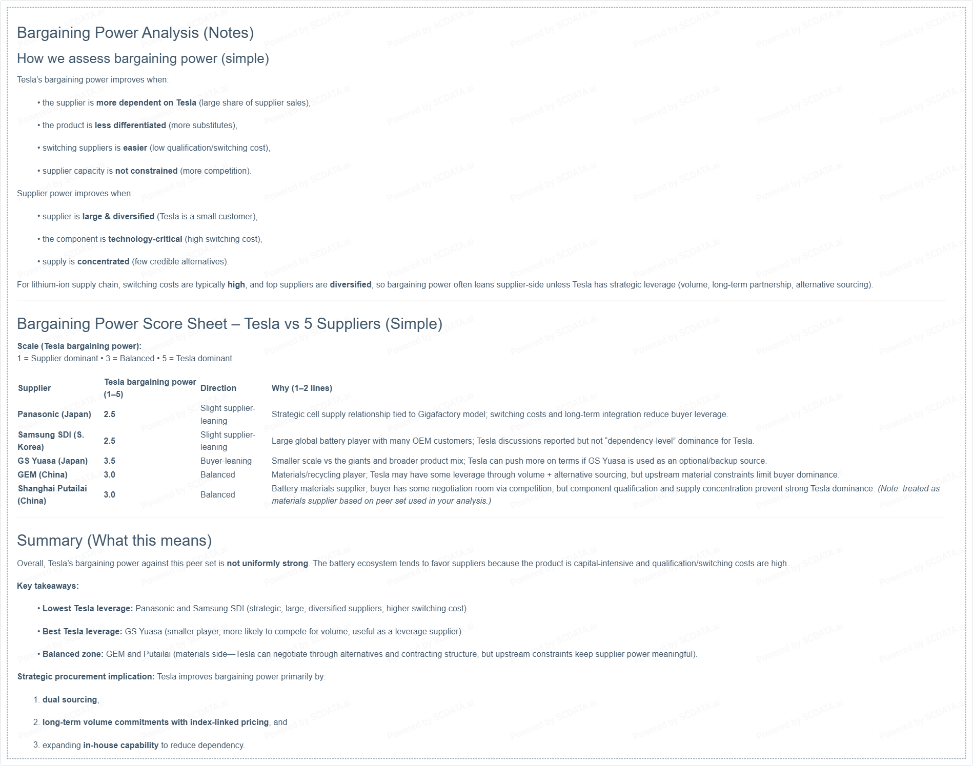 For lithium-ion supply chain, switching costs are typically high, and top suppliers are diversified, so bargaining power often leans supplier-side unless Tesla has strategic leverage (volume, long-term partnership, alternative sourcing).