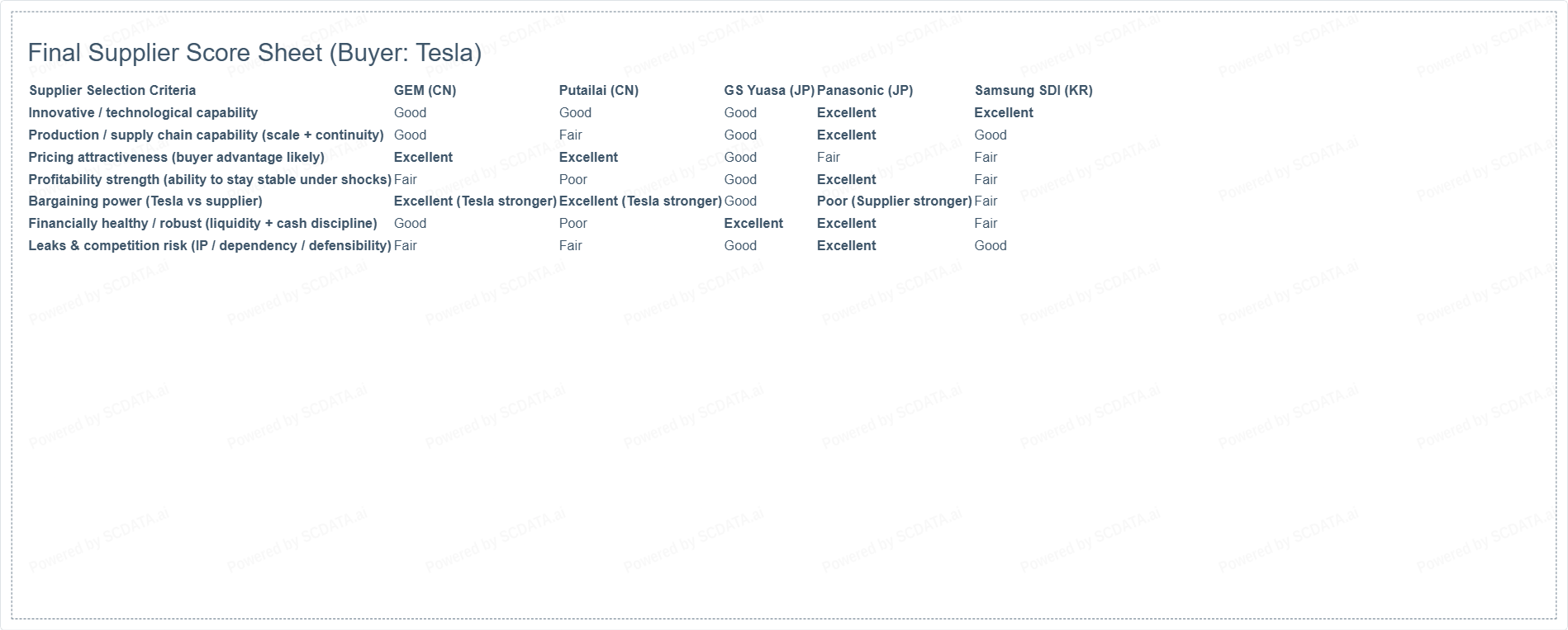 | GS Yuasa (Japan) | 3.5 | Buyer-leaning | Smaller scale vs the giants and broader product mix; Tesla can push more on terms if GS Yuasa is used as an optional/backup source. |