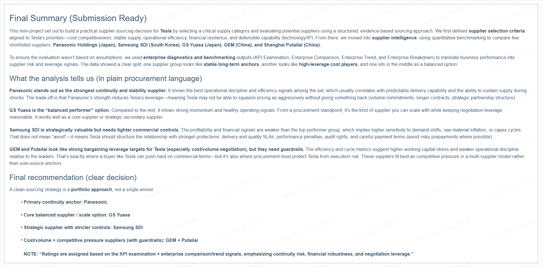 This mini-project set out to build a practical supplier sourcing decision for Tesla by selecting a critical supply category and evaluating potential suppliers using a structured, evidence-based sourcing approach. We first defined supplier selection criteria aligned to Tesla’s priorities—cost competitiveness, stable supply, operational efficiency, financial resilience, and defensible capability (technology/IP). From there, we moved into supplier intelligence, using quantitative benchmarking to compare five shortlisted suppliers: Panasonic Holdings (Japan), Samsung SDI (South Korea), GS Yuasa (Japan), GEM (China), and Shanghai Putailai (China).