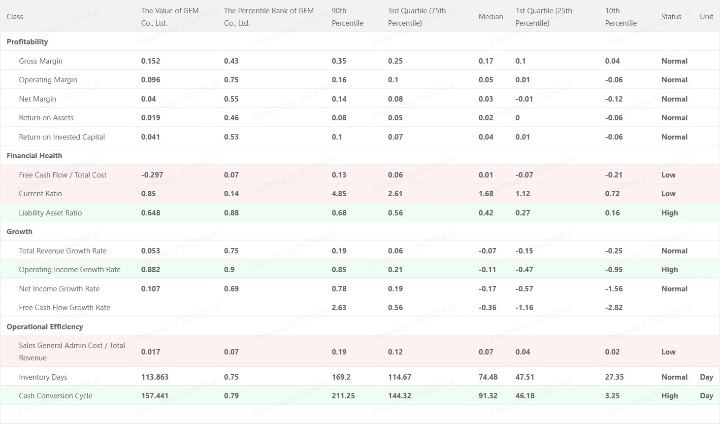GS Yuasa shows volatility risk: COGS 77.58%, Net income 6.79%, but Other Costs 13.95% is a big warning sign.