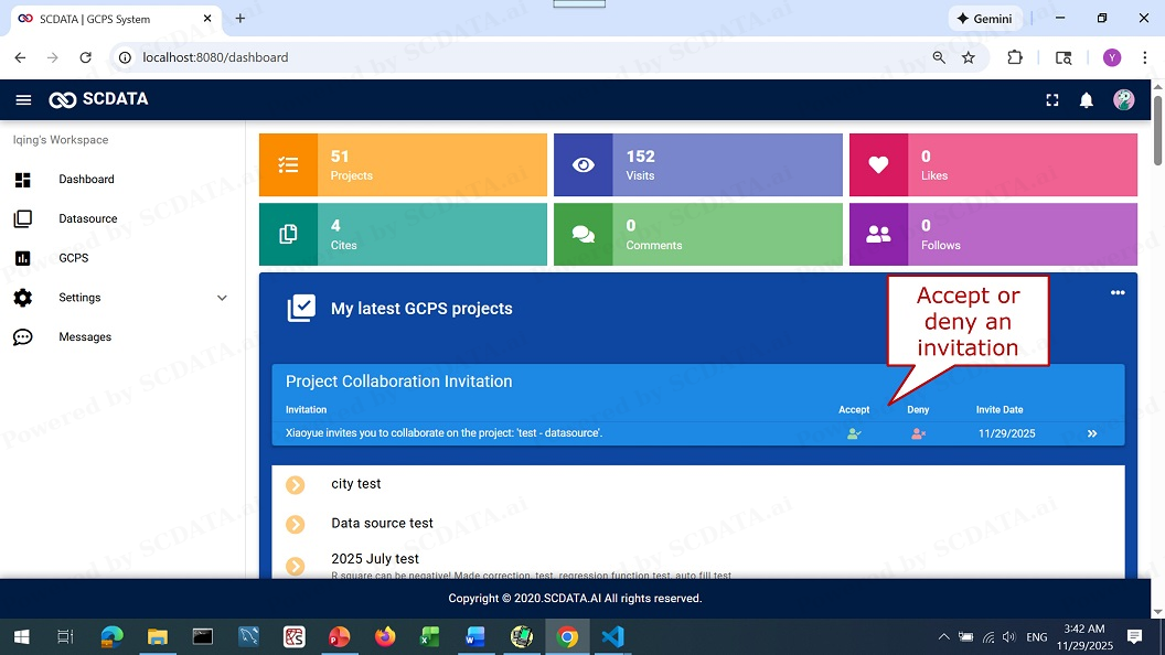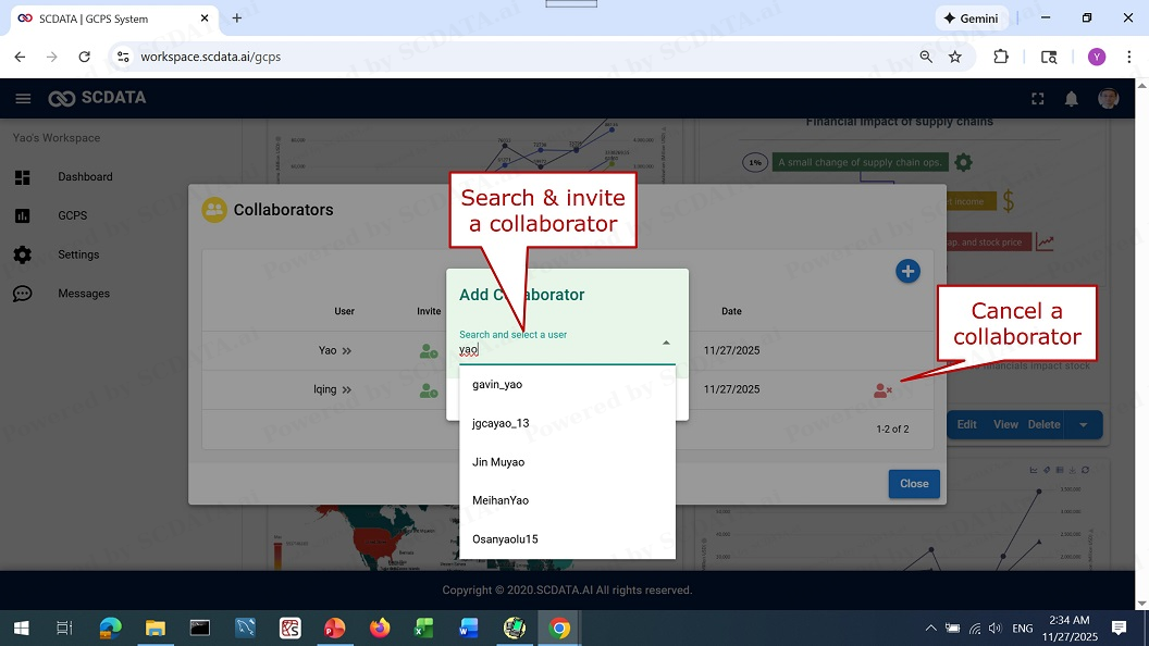 A user can invite other users to work on one project as collaborators, or cancel the collaboration if deem necessary