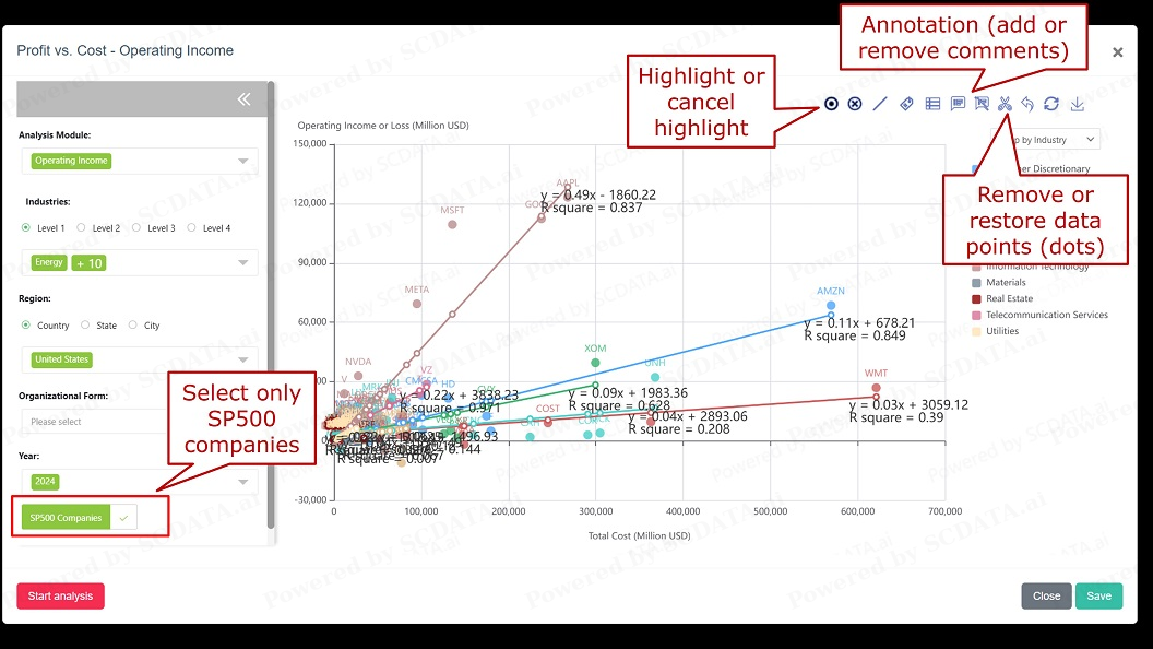 Left panel: select variables for X and Y by searching or browsing. Select industry. Company selection is optional: if selected, only plot them. Otherwise, plot all companies in the selected industry.