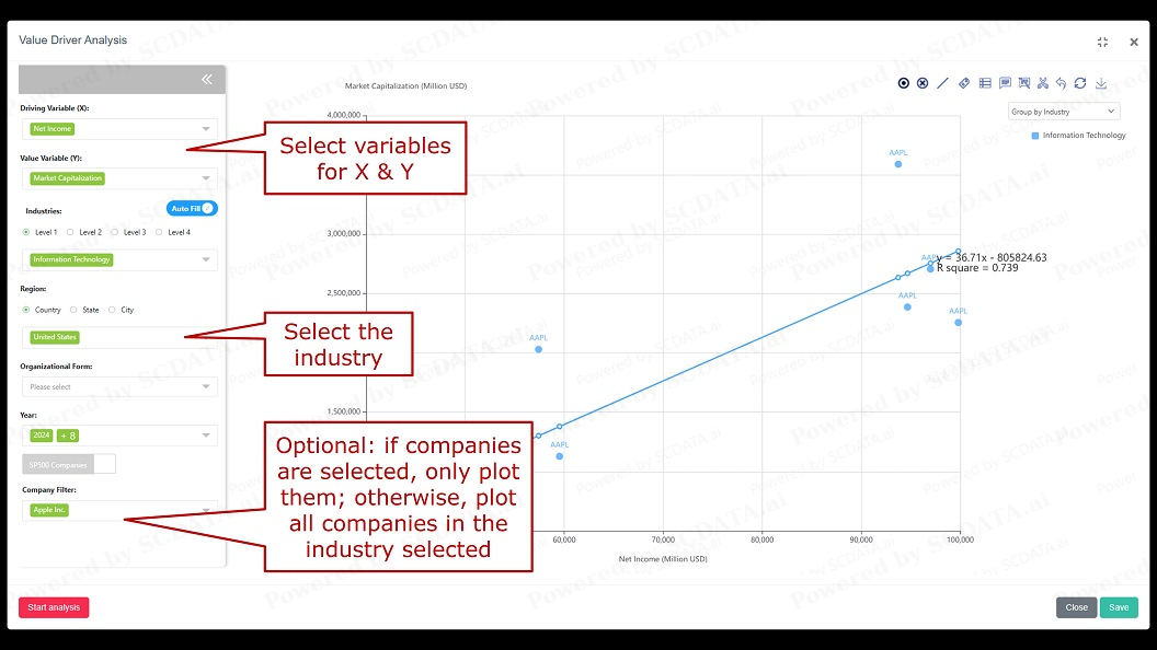 Value driver analysis helps to find causal relationship between two variables or KPIs for specific companies or all companies in an industry.