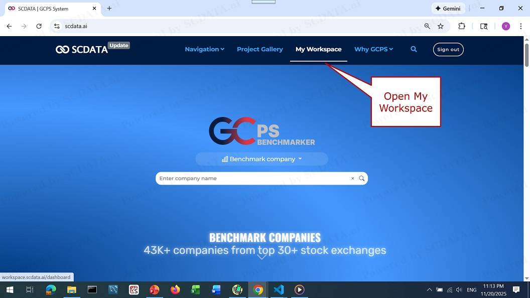 In your workspace, you will first see your dashboard which summarizes your activities, such as, your current projects and your interactions with other users, for example, likes, cites or copies, comments. If you want to create some analysis, please click on GCPS.