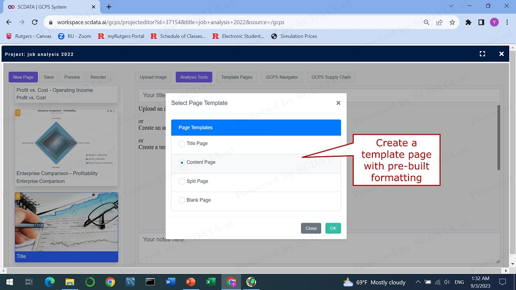 It will be much easier for people to understand and appreciate your work if you can include some template pages into your project to summarize your findings and insights. There are four types of template page to choose from, such as the title page, the content page and the split page, and blank page.