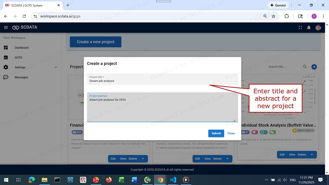 In GCPS, you can create a new project and search for existing projects by title. You can edit the title and abstract of a project. You can also edit the content of a project, slide-show / view the project, and delete the project. Finally, you can invite other users to collaborate on a project, copy a project, merge multiple projects into one, download a project into PDF file, and notify your followers of this project.
