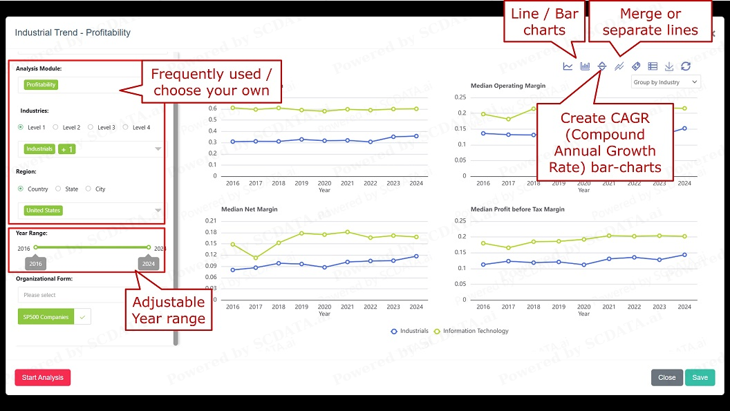 Left panel: Analysis module on different KPI combinations, pre-mixed / frequently used vs. choose your own / customized (total or median), Year range can be changed.