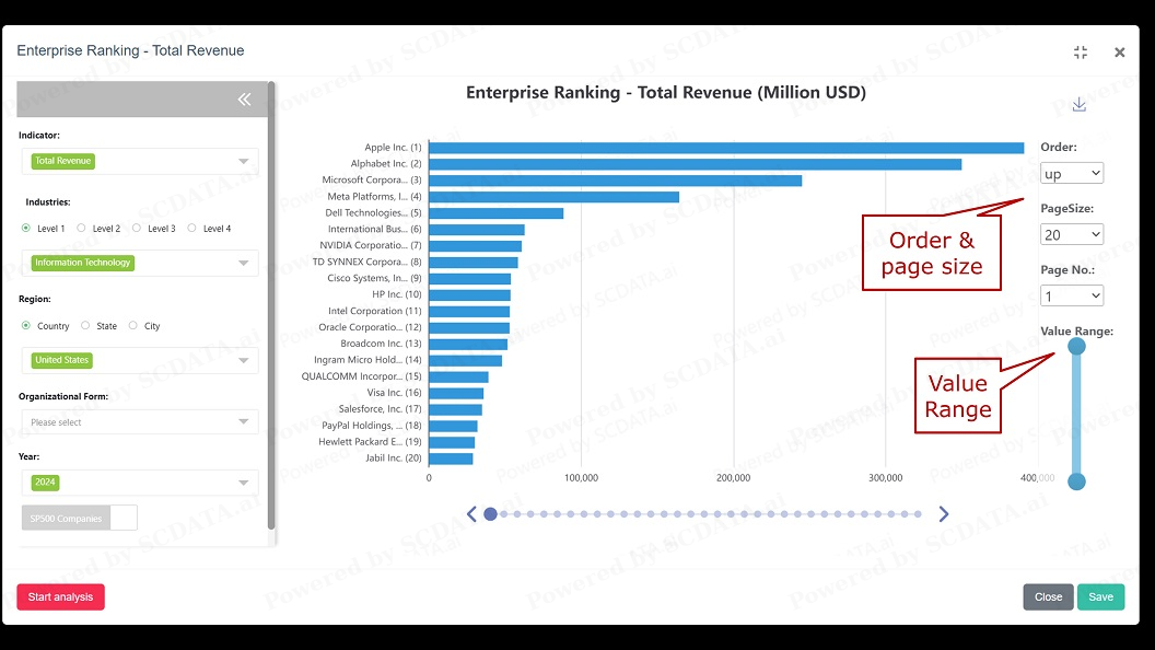 Ranking enterprises by a KPI of your choice. New features: order (up / ascend or down / descend). Page size: how many companies to show each page. You can also select the value range to narrow down the ranking of enterprises to those with values in a specific range.