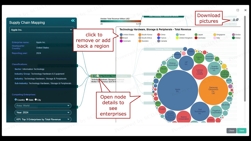 Open node (industry) details you can see all companies in this industry. Click on the regions to remove or add back regions. You can also download the pictures, and save the result.