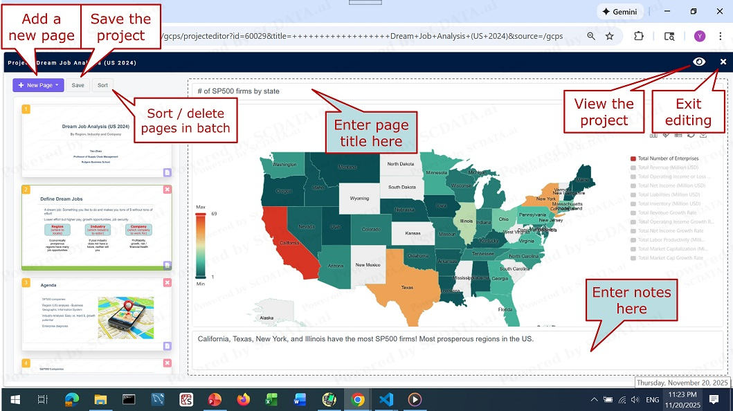 When you edit a project, you can add a new page, save the project, preview the project, and sort and delete pages in batch. On each page, you can add the title of the page here, and enter your notes / insights etc. here. Once you are done, you can view or slide show the project here and exit editing here.